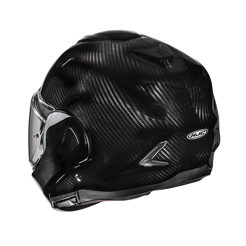 Il casco F100 Carbon reversibile con doppia omologazione P/J di HJC per uso stradale e turistico ha una calotta ultraleggera in fibra di carbonio avanzata che lo rende un casco leggero ma altamente resistente agli urti.