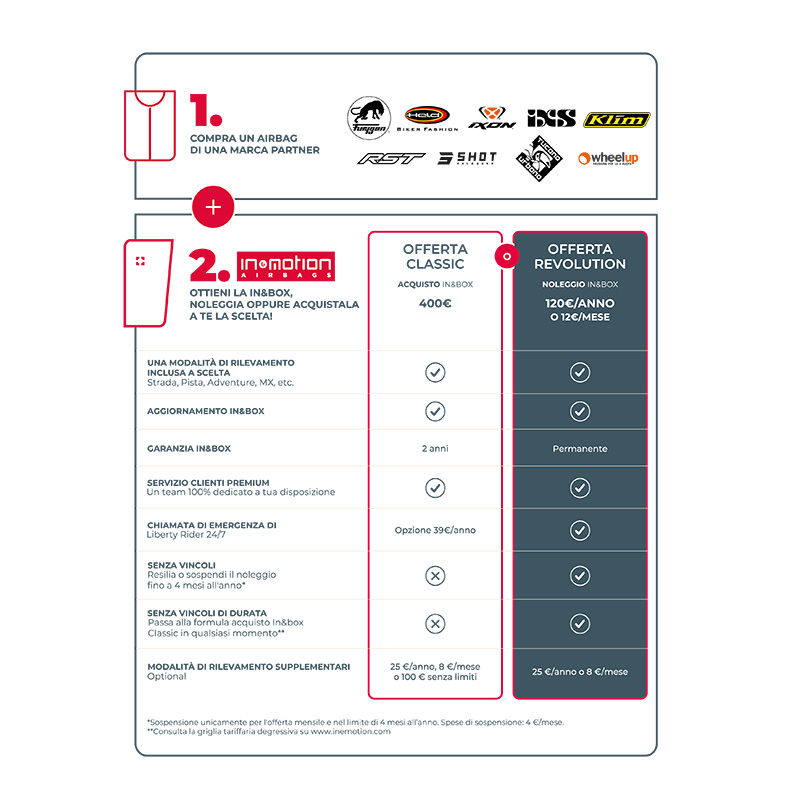 È necessario un abbonamento In&motion, con noleggio o acquisto dell'unità elettronica In&box. L'offerta In&Box Revolution a 120 € / anno o 12 € / mese corrisponde a un abbonamento senza impegno per il noleggio dell'unità, l'offerta In&Box